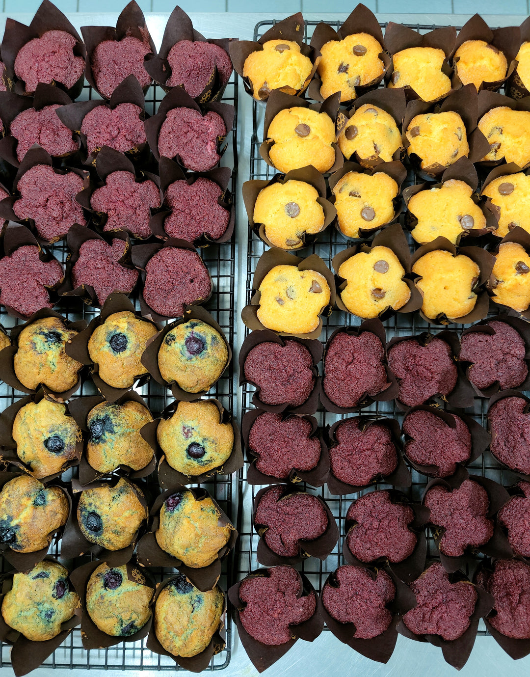 A variety of danishes, scones, mini muffins, savoury quiches, savoury muffins, biscuits, and Assorted Cakes Slices
