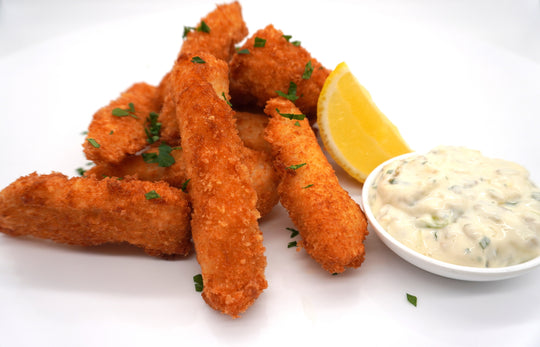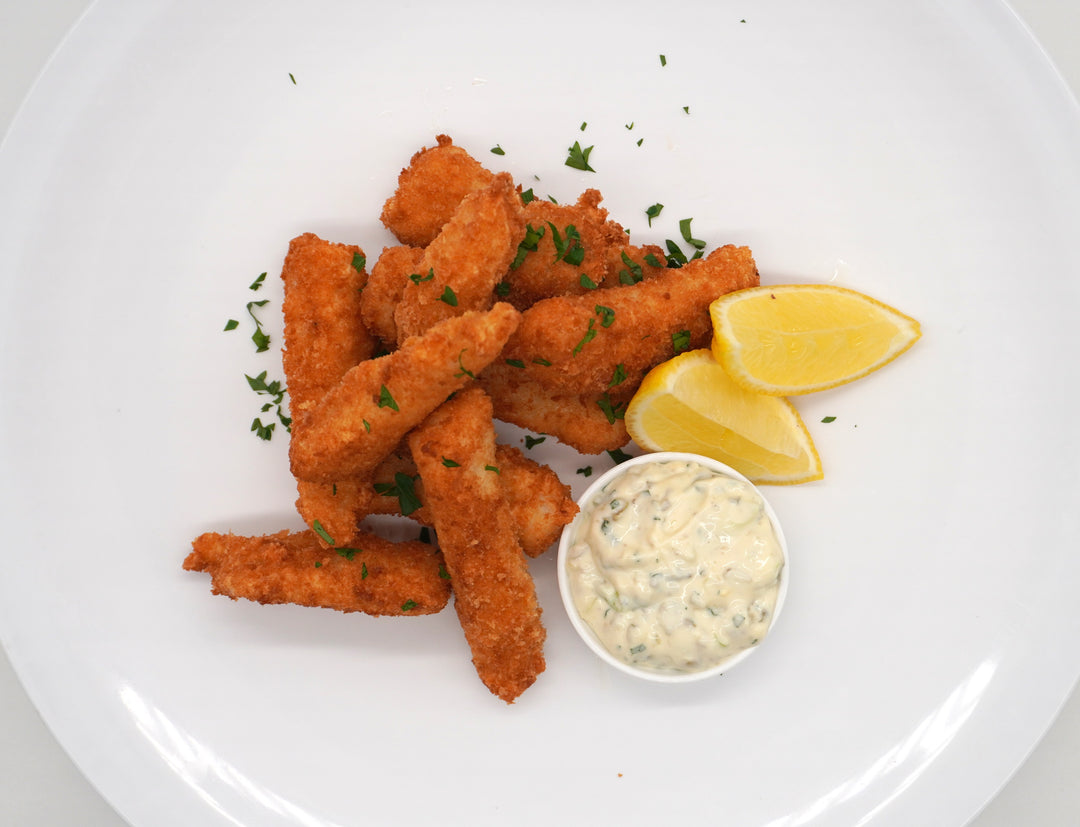 A minimum of 15 individual fish pieces, encased in a golden crumb coating, accompanied by tartare and fresh lemon.