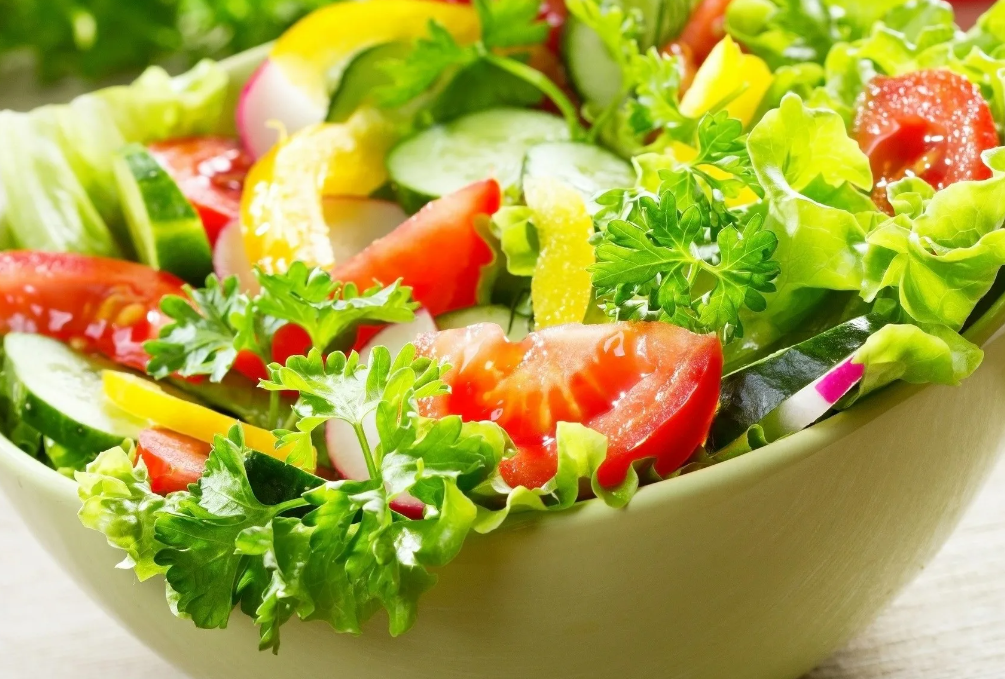 This healthful Garden Salad combines fresh lettuce, cucumber, tomato, capsicum, and vegan house vinaigrette, and is free of gluten, dairy, and meat.