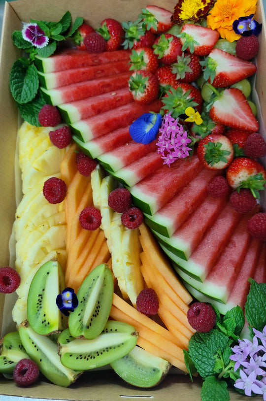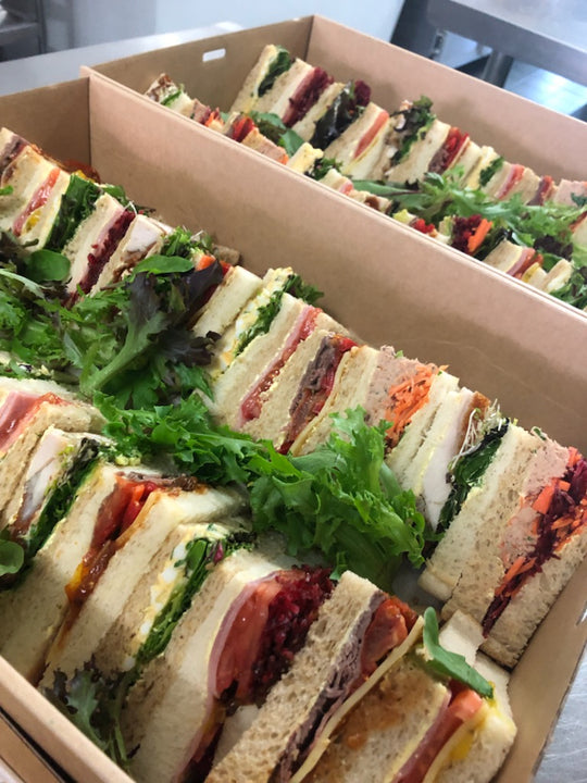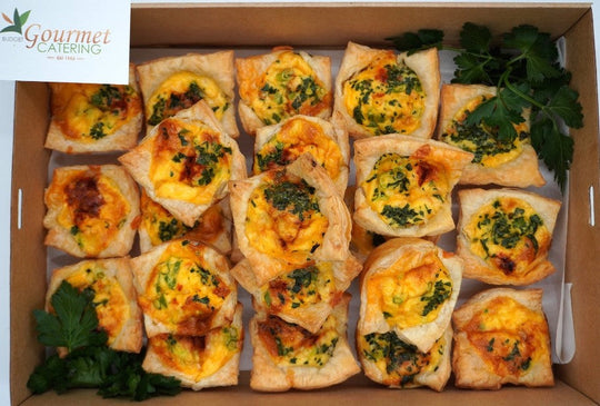 Per person: 1x Mixed Sandwiches, 1x Mini Quiche, 1x Fruit Platter and 1x Assorted Cake Slice.